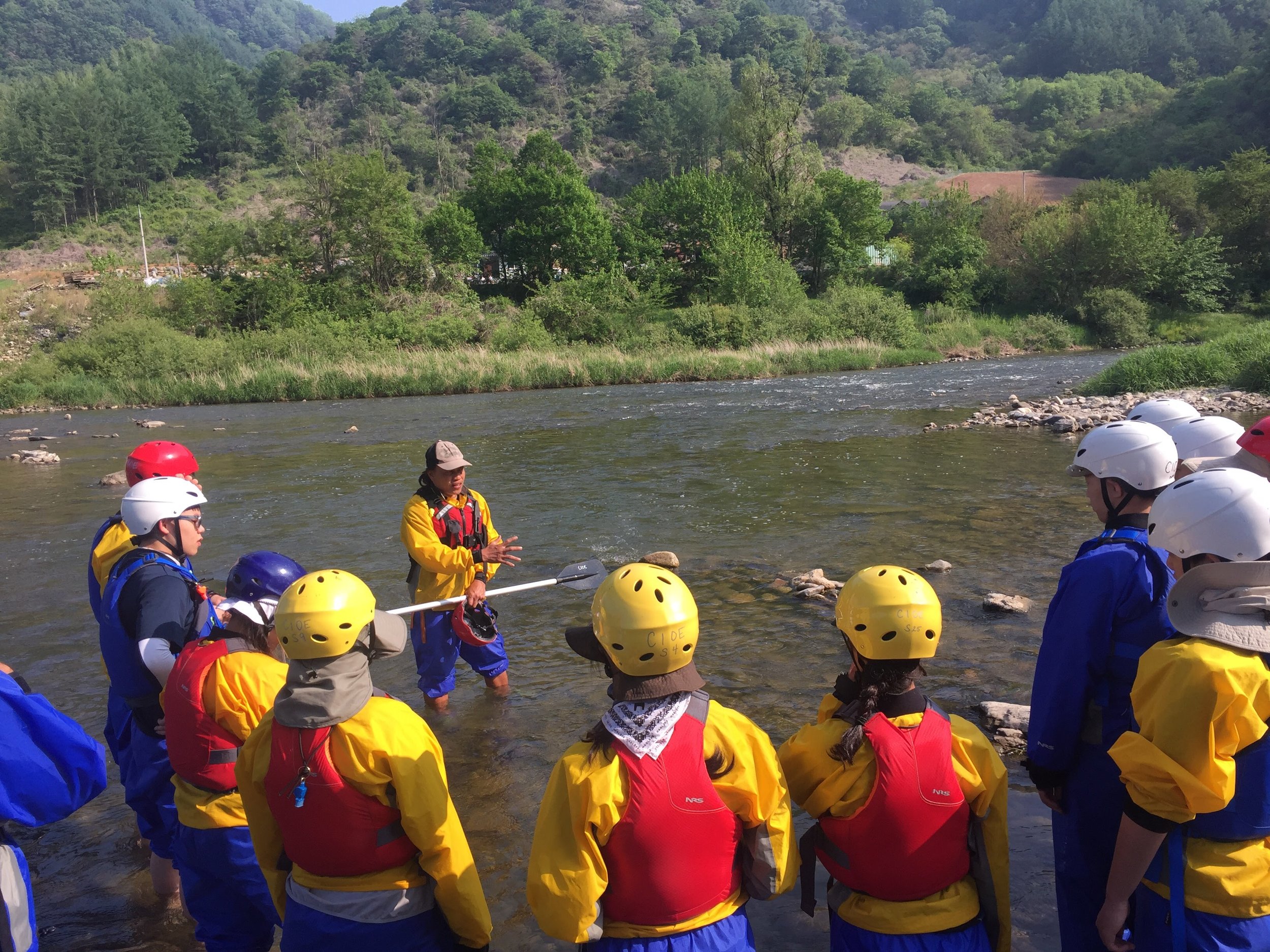 Safety briefing! Getting ready to paddle downstream.