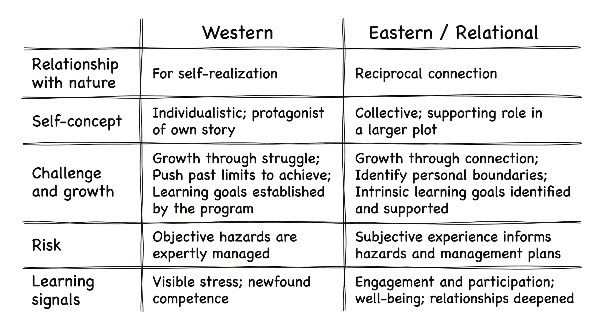 This table contrasts two cultural paradigms that shape how outdoor education understands nature, challenge, risk, and learning. The most effective programs integrate both, balancing individual growth with relationship, context, and care.